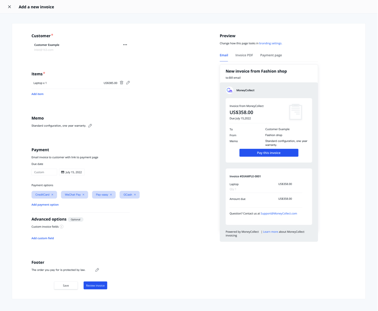 支持收取一次性付款或週期性付款。根據您的需求在帳單中增加您的品牌logo,訂單類目,客戶註釋以及各項服務條款和說明。