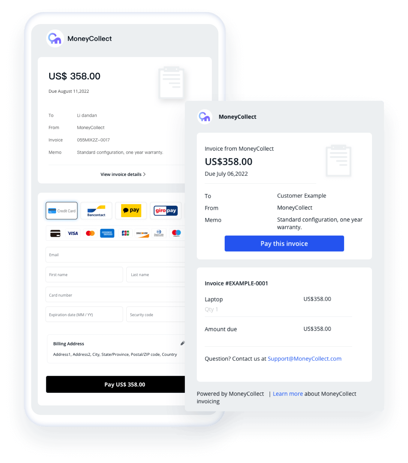 專業的帳單頁面可以給客戶提供更好的印象,建立對品牌的信任,並鼓勵客戶完成付款。 MoneyCollect可讓您在幾秒鐘內創建專業帳單。