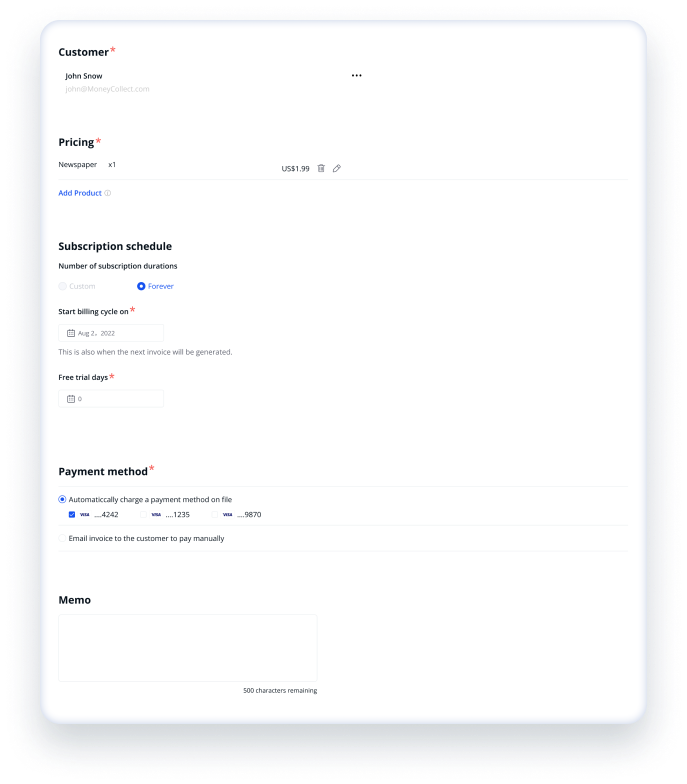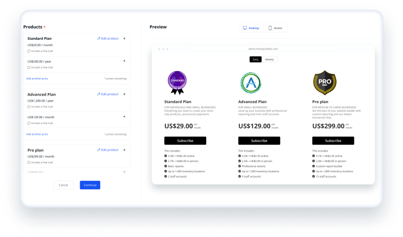 通過MoneyCollect儀表板,您可以輕鬆地創建和管理訂閱,無需編寫代碼。可自定義的訂閱間隔和持續時間也可根據您的業務情況進行調整。此外,您還可以通過提供免費試用期來吸引用戶,使用各種價格模型。